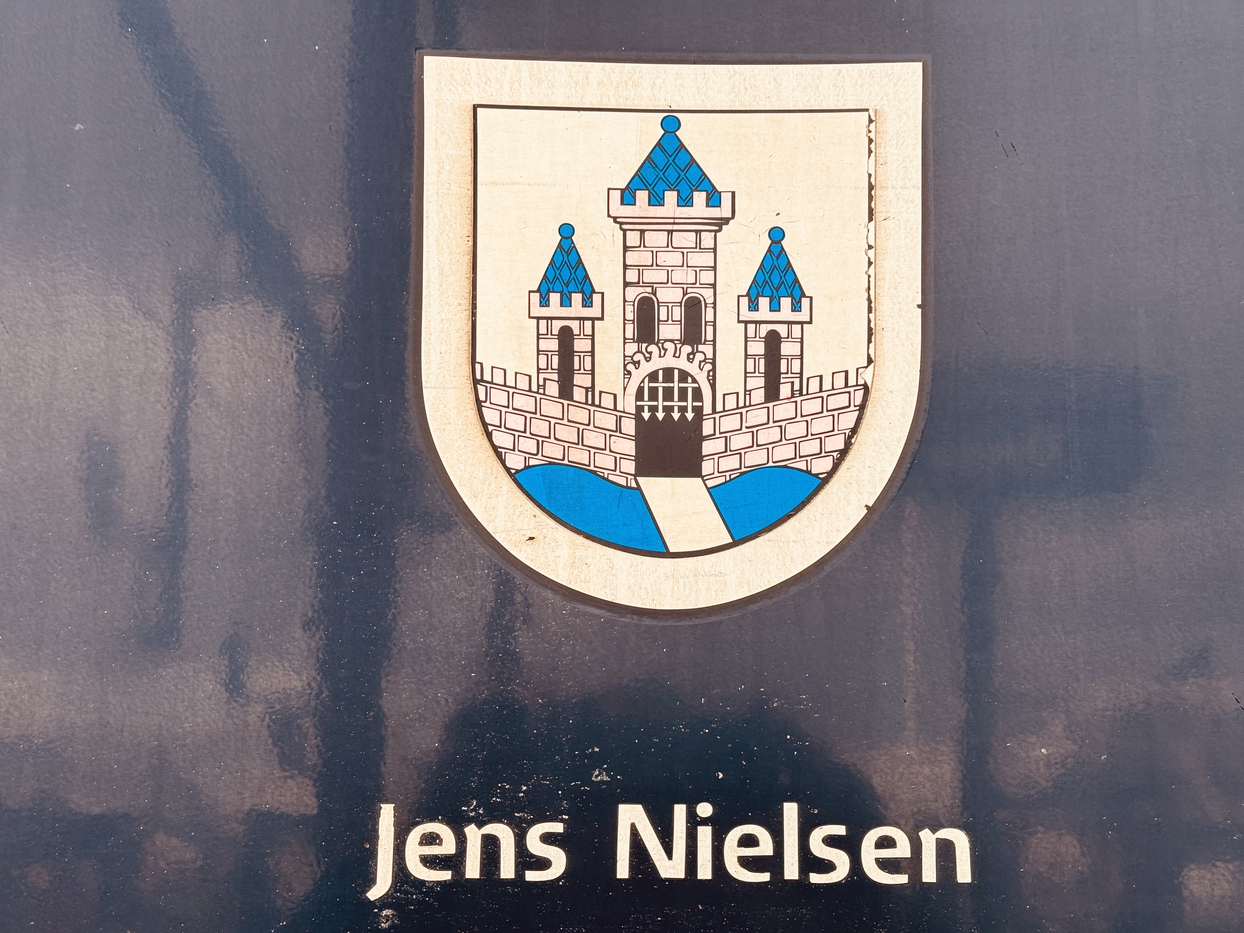 Billede af Randers byvåben og navngivet "Jens Nielsen" på siden af DSB MF 5085 fotograferet ud for København Hovedbanegård.